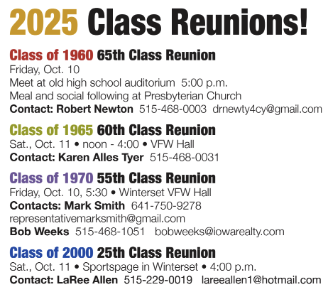 Please contact Billi Jo (Akers) Hartman at bhartman@winterset.k12.ia.us, 515-462-2718 with information about your upcoming reunion, or for help with mailing lists and supplies.